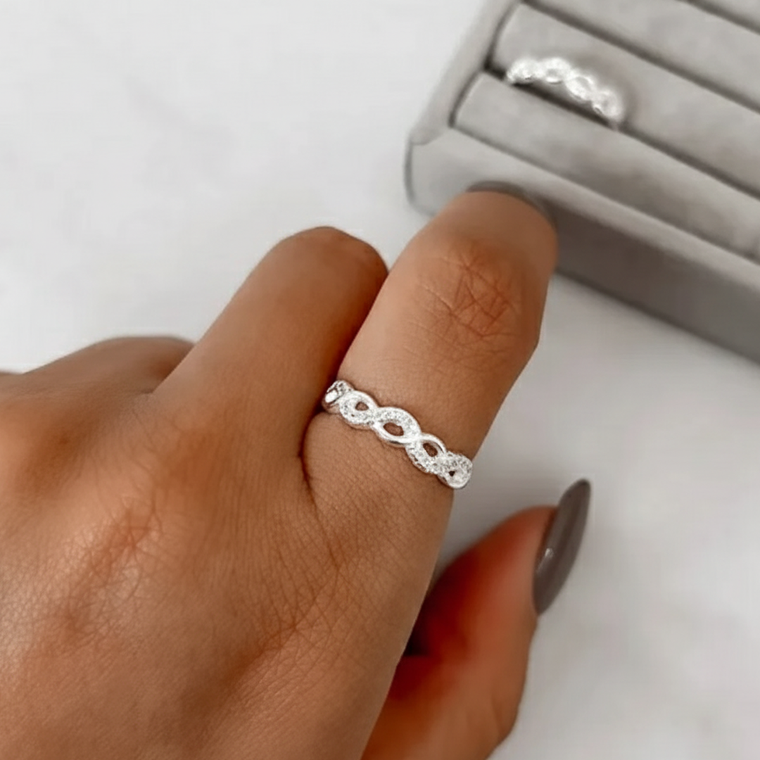 O Anel Trançado Detalhe Cravejado apresenta um design sofisticado, com linhas entrelaçadas que simbolizam união e eternidade. Seu acabamento delicado é realçado por pequenas zircônias cristalinas cravejadas ao longo da trama, conferindo um toque de luminosidade e requinte à peça. Produzido em Prata 925 legítima, garante alta durabilidade, conforto e um brilho duradouro. O design trançado proporciona um visual moderno e versátil, ideal para uso diário ou para composições com outros anéis.