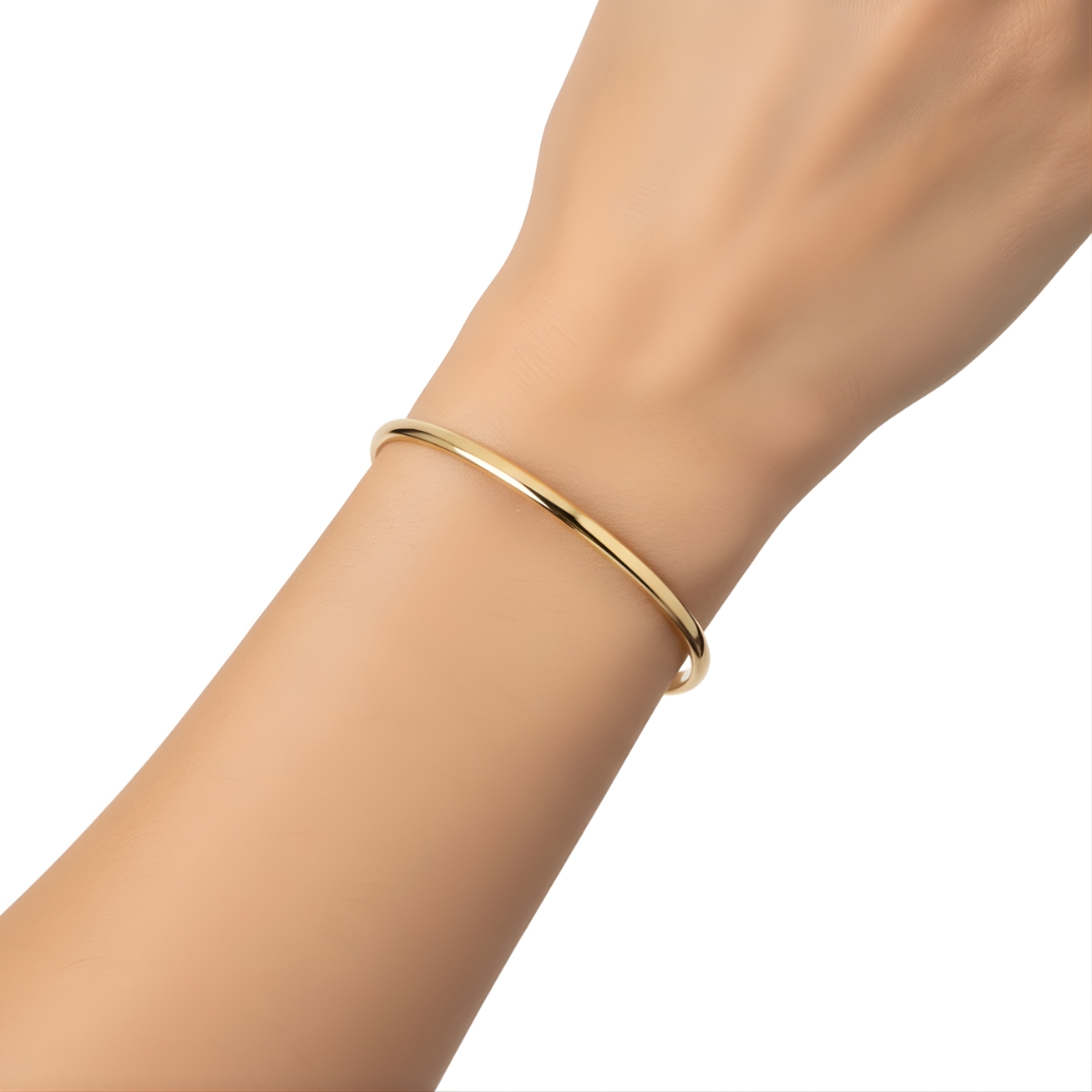 Este bracelete liso banhado a ouro 18K é a escolha perfeita para quem busca elegância sem excessos. Seu design clean e acabamento espelhado refletem a luz com delicadeza, destacando o brilho natural do metal e trazendo um toque de luxo para qualquer ocasião. Ideal para compor com outros acessórios ou usar sozinho, o bracelete oferece versatilidade e estilo, sendo perfeito tanto para o dia a dia quanto para eventos especiais.