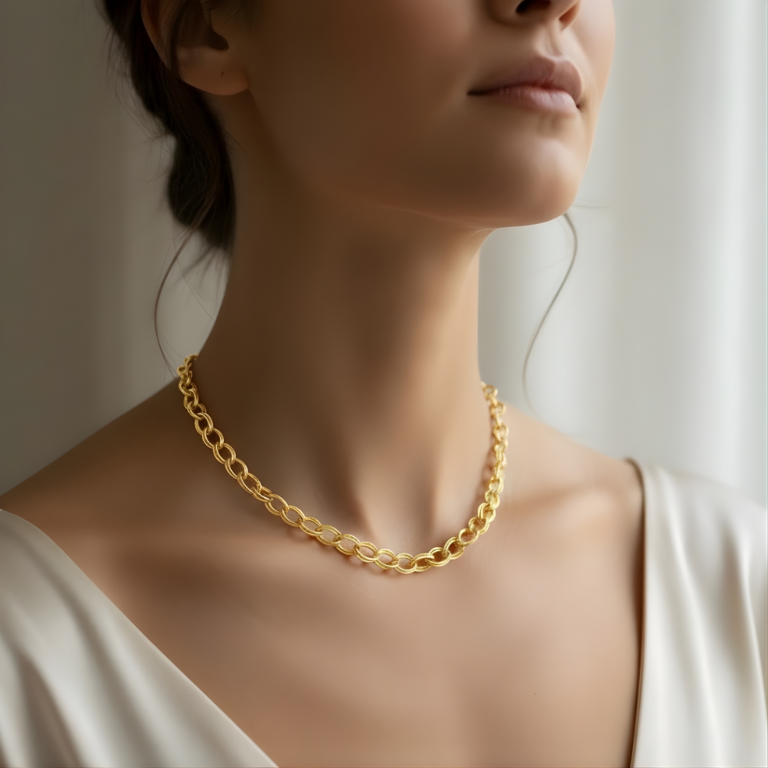 O Colar Elo Duplo é uma peça marcante que une resistência e sofisticação. Com elos robustos de 6mm, em design duplo e acabamento polido, esse colar transmite imponência e personalidade. Seu banho em ouro traz brilho intenso, garantindo um visual moderno e elegante.